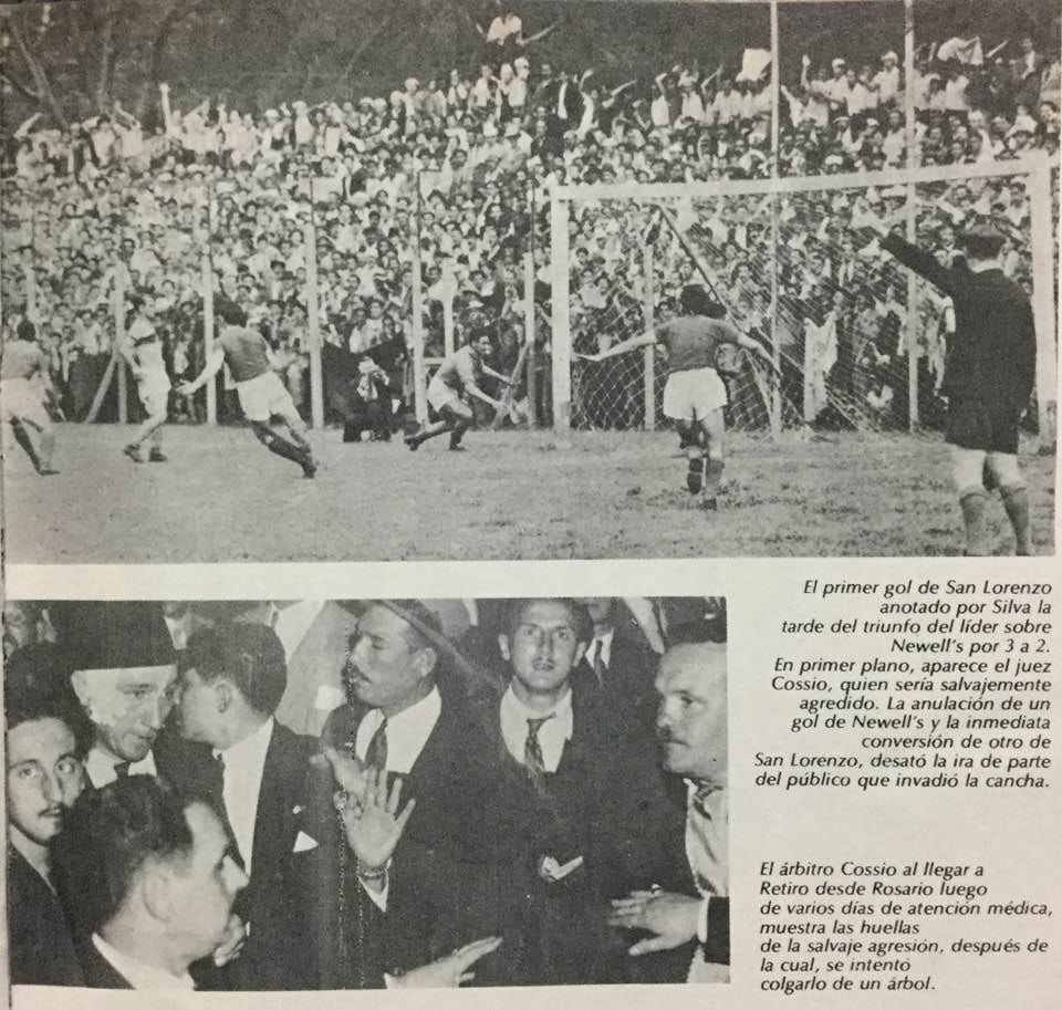 46. El 27 de octubre de 1946 jugamos contra San Lorenzo que venía puntero. Lo perdíamos 2 a 0, lo empatamos 2 a 2 y sobre el final del partido metimos el tercero pero al referí Osvaldo Cossio se le dio por cobrar no sé qué cosa y lo anuló. A la jugada siguiente, gol de San Lorenzo. Inmediatamente después, un montón de hinchas se metieron al campo de juego para ir a buscar a Cossio, que escapó metiéndose en el vestuario. Hasta allí lo siguieron y trató de continuar su huida corriendo hacia el Parque. Un auto lo chocó, cayó al piso, lo atraparon, le pegaron, uno sacó un cinturón y se lo ajustó al cuello, otro lo llevó hasta un árbol y quiso colgarlo de una rama, en eso aparecieron tres conscriptos, desenfundaron sus sables contra la turbamulta y le salvaron la vida a Cossio, que igual terminó internado en el Sanatorio Británico.