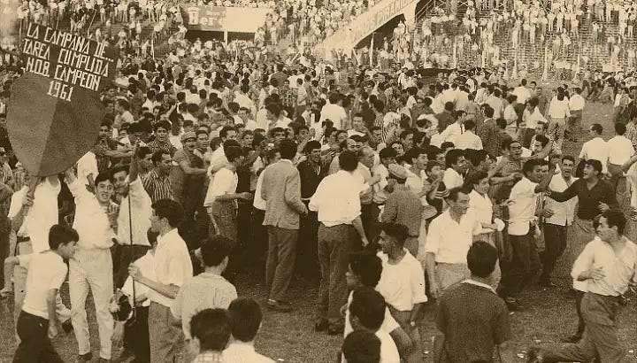 60. Sí, una vez nos fuimos a la B, ¿y qué? Al año siguiente ascendimos en la cancha y nos cagaron en AFA. Así lo explicaba Dante Panzeri en la edición Nº2214 de El Gráfico, del 14 de marzo de 1962: “Queda una sola palabra: REPUNGNANCIA”.